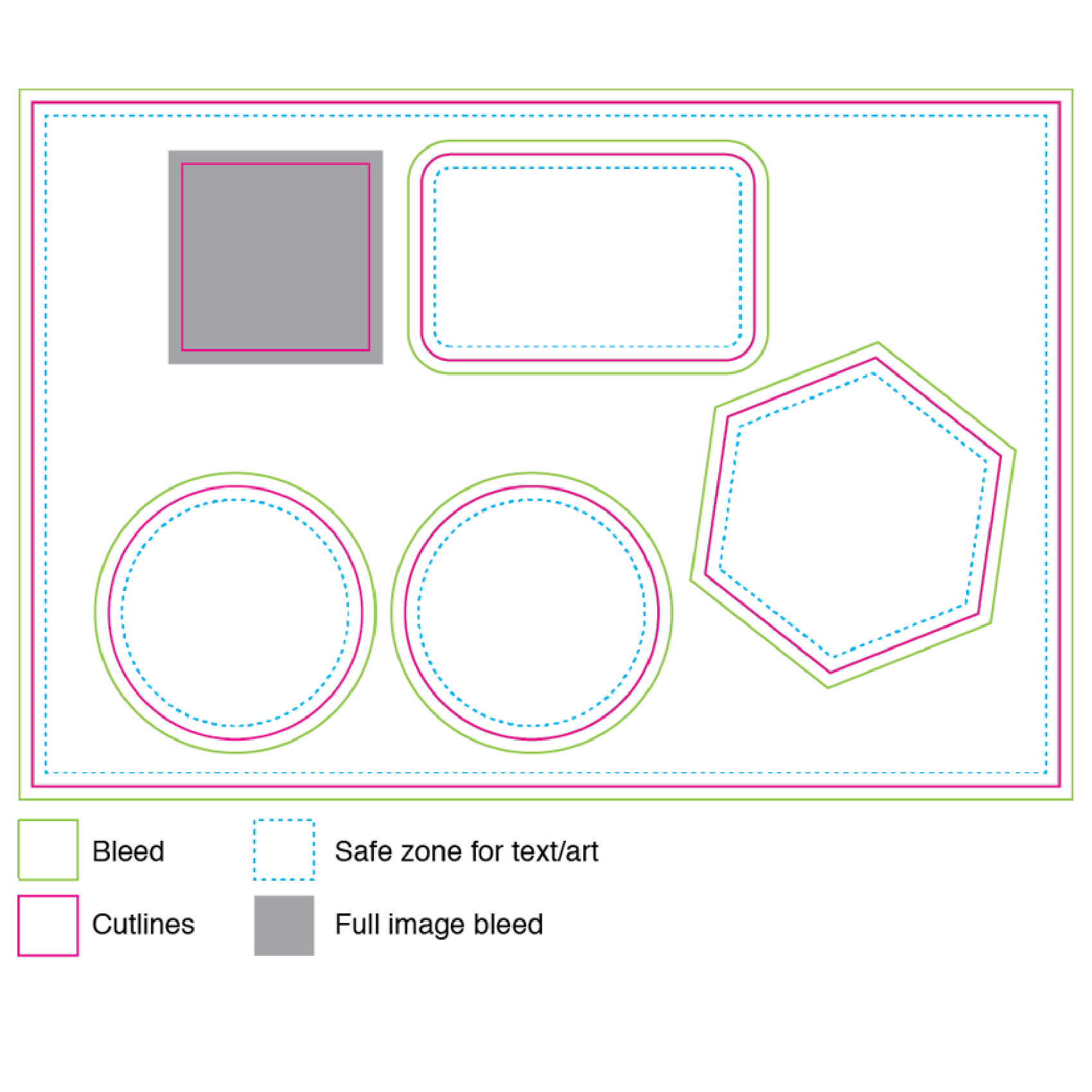 カットラインはアートワークの外側0.076インチ/2 mmに配置する必要があります。ボーダーなしでステッカーを印刷したい場合は、デザインをカットラインから0.076インチ/2 mm伸ばしてください。